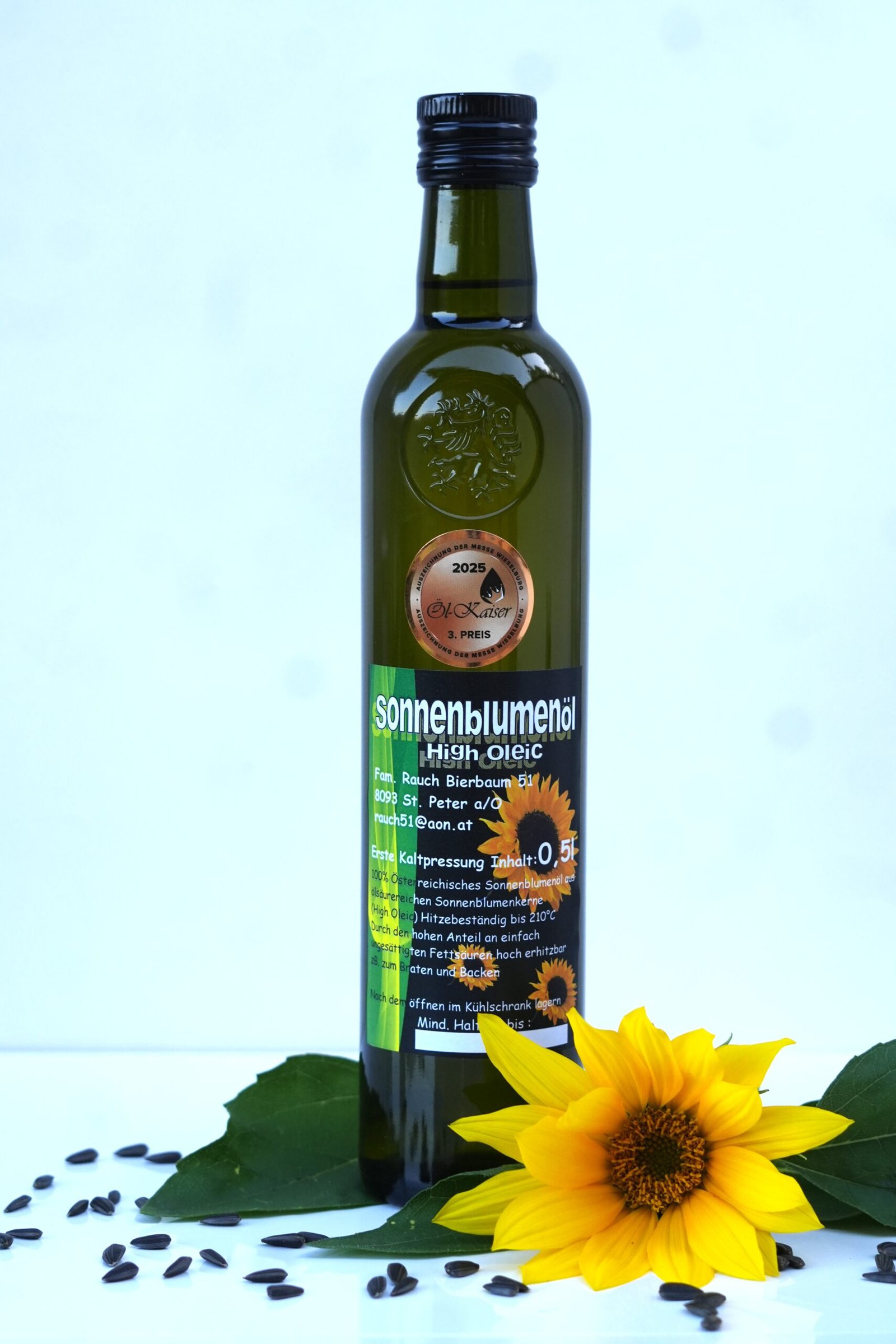 Dieses Öl pressen wir aus einer speziellen Sonnenblumensorte mit einem hohen Ölsäure-Anteil. Dadurch hat es einen höheren Rauchpunkt als andere kaltgepresste Öle. Es ist somit zum leichten Erhitzen geeignet. Außerdem verleiht es kalten Speisen und Salaten ein leicht nussiges Sonnenblumenaroma.